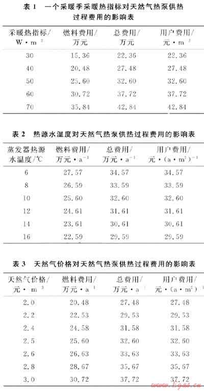 基本條件中,只有采暖熱指標(biāo)變化對天然氣熱泵供熱費用的影響見表1;只有熱源水溫度變化對費用的影響見表2;只有天然氣價格變化對費用的影響見表3。由表可知,天然氣熱泵供熱費以燃料費用為主,降低采暖費用的主要措施是提高燃料的利用效率。