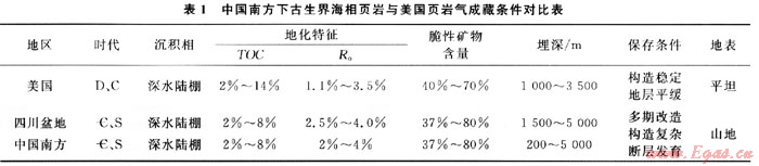 我國(guó)南方地區(qū)具有與美國(guó)東部盆地相似的頁巖氣成藏地質(zhì)條件和構(gòu)造演化歷史,均屬于古生代海相沉積盆地;沉積環(huán)境為深水相沉積、淺-深水陸棚相;頁巖的TOC>2%,為富有機(jī)質(zhì)頁巖,有機(jī)質(zhì)類型為腐泥混合型;頁巖脆性礦物含量較高,石英、長(zhǎng)石、方解石等脆性礦物總含量大于40%[9~14]。應(yīng)該看到,中國(guó)和美國(guó)頁巖氣成藏條件也存在較大的差異性(表1),主要表現(xiàn)在以下幾個(gè)方面: