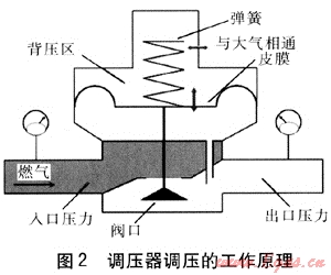 回顧調(diào)壓器的工作原理,不難發(fā)現(xiàn),影響調(diào)壓的因素有彈簧、皮膜、皮膜上下方壓力差。調(diào)壓器調(diào)壓的工作原理見圖2。