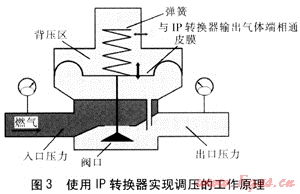 使用IP轉換器遠程調(diào)壓的工作原理見圖3,IP轉換器的輸出氣體端連接皮膜上方。當IP轉換器接收到的模擬信號量變大,背壓區(qū)壓力升高,壓力差使皮膜及閥口連桿向下運動,閥口開度增大,下游壓力升高;當IP轉換器接收到的模擬信號量變小,背壓區(qū)壓力降低,壓力差使皮膜及閥El連桿向上運動,閥口開度減小,下游壓力降低。整個控制過程平緩且無需強外力驅(qū)動,大大減小了彈簧的強制動作受壓,與正常調(diào)壓時各部件動作幅度無異。