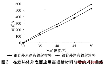 測(cè)試平臺(tái)如下:一個(gè)長(zhǎng)600mm、寬600mm、高480mm的鐵皮箱,外表覆蓋保溫棉,內(nèi)部以石英加熱管作為熱源,在石英加熱管外部套上鋼管,鋼管受熱后,加熱旁邊的水杯。采用兩種測(cè)試方案,第一種方案是在鋼管外部涂刷高輻射材料,記錄杯中水的溫升隋況,另一種方案是鋼管外部不涂刷高輻射材料,杯內(nèi)放同樣質(zhì)量的水,記錄水的溫升情況。多次測(cè)量后,取平均值。在發(fā)熱體外表面應(yīng)用高輻射材料前后的對(duì)比曲線見(jiàn)圖2。