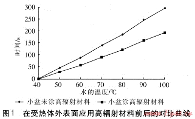 測(cè)試平臺(tái)如下:兩個(gè)一樣的不銹鋼小盆,直徑為160mm,一個(gè)在盆底涂刷高輻射材料,另一個(gè)不涂,小盆裝相同的水,在相同的電爐上測(cè)試水的升溫時(shí)間,多次測(cè)量后,取平均值。在受熱體外表面應(yīng)用高輻射材料前后的對(duì)比曲線見(jiàn)圖1。