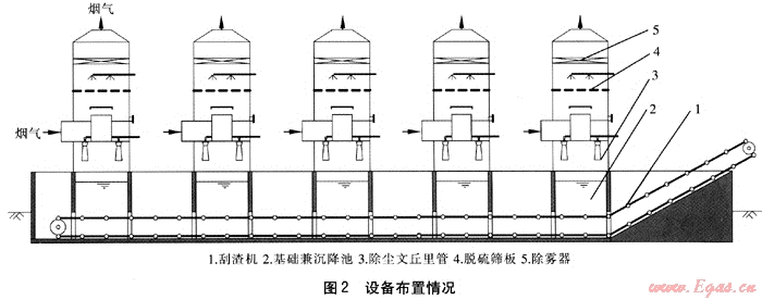 脫硫除塵裝置安裝在原除塵器的位置,底部基礎(chǔ)兼做沉降池,在池底安裝刮渣機(jī),5臺雙循環(huán)煙氣脫硫除塵裝置基礎(chǔ)連通,共用一臺刮渣機(jī),沉降的灰渣經(jīng)刮渣機(jī)的框鏈集中運(yùn)輸?shù)交覉?。雙循環(huán)脫硫除塵裝置總阻力比原除塵器僅增加500Pa,因此可保留原引風(fēng)機(jī)。增加一個除塵水循環(huán)池和一個堿液循環(huán)池,除塵水循環(huán)池與沉降池連通,除塵水循環(huán)泵將除塵水通過噴頭送入文丘里管與煙氣混合,在喉口處煙塵與液滴充分混合,煙塵被加濕粒化高速流出文丘里管后沖擊液面,被液面捕集,灰渣沉降于池底被刮渣機(jī)清除,清液流回除塵水循環(huán)池循環(huán)使用。堿液循環(huán)泵將堿液送入脫硫塔,在篩板上與除塵后的煙氣混合形成流化床,煙氣中的二氧化硫被吸收,脫硫后的煙氣經(jīng)除霧器脫水后排出,脫硫后的堿液經(jīng)排液口流回堿液循環(huán)池調(diào)整pH值后循環(huán)使用。設(shè)備外部堿液循環(huán)管道和除塵水循環(huán)管道均采用UPVC工程塑料管。