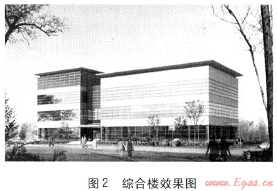 綜合樓建筑風(fēng)格簡(jiǎn)潔現(xiàn)代,結(jié)合總圖采取矩形布局,建筑朝向?yàn)槟媳毕颍L(zhǎng)邊與廠外主要道路平行。建筑體型采用三個(gè)不同高度的體塊相間穿插布置,顯得錯(cuò)落有致。建筑外檐采用帶形熱反射玻璃幕墻與鋁合金金屬幕墻相結(jié)合,線條流暢,給人一種十足的現(xiàn)代感。局部安放空調(diào)室外機(jī)組的屋面采用金屬百葉做圍護(hù)結(jié)構(gòu),既對(duì)設(shè)備起到了視覺上的遮擋作用,本身又成為外立面不可或缺的重要組成部分,可謂一舉兩得。縱觀整個(gè)建筑,本身并不作繁冗裝飾,而是采用豐富的體型、干凈利落的細(xì)部刻畫以及協(xié)調(diào)大方的色彩取勝。而鋁合金金屬幕墻、熱反射玻璃幕墻、鋁合金裝飾百葉這些新材料的運(yùn)用,又使整個(gè)建筑顯得既簡(jiǎn)潔明快,又不乏時(shí)代感,反映了工業(yè)建筑的精神,現(xiàn)代企業(yè)的氣質(zhì)也在這里得以彰顯。綜合樓效果圖見圖2。