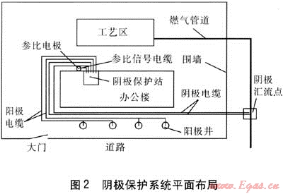 2008年為了保證福建LNG福州天然氣項目按期投產(chǎn),福州華潤燃氣有限公司在福州城門建設(shè)管輸天然氣門站,同時為保護市政中壓燃氣管道,在城門門站新建外加電流深井陽極陰極保護系統(tǒng)。該陰極保護系統(tǒng)平面布局見圖2。