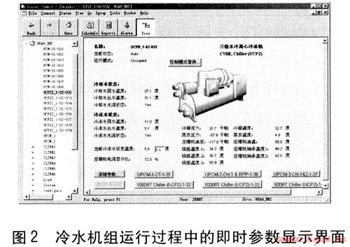 b. 可以根據(jù)運(yùn)行管理的要求,對(duì)設(shè)備進(jìn)行自動(dòng)數(shù)據(jù)采樣。自動(dòng)儲(chǔ)存采樣數(shù)據(jù)或進(jìn)行打印,采樣間隔可設(shè)定為5min~2h。冷水機(jī)組運(yùn)行過程中的即時(shí)參數(shù)顯示界面見圖2。由圖2可知,冷水機(jī)組的主要運(yùn)行參數(shù)都能在界面中反映出來,包括冷卻水溫度、冷水溫度、流態(tài)、蒸發(fā)器、冷凝器溫度及壓力、壓縮機(jī)運(yùn)行電流等。運(yùn)行人員可通過界面了解到冷水機(jī)組的即時(shí)詳細(xì)的數(shù)據(jù),以進(jìn)行相應(yīng)的數(shù)據(jù)記錄與分析。