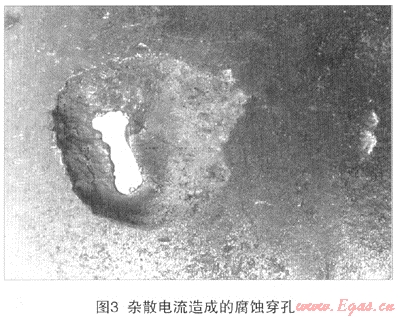 實際上,城市燃氣管道周邊往往存在強烈的雜散電流[3],對在役管道的開挖檢測發(fā)現(xiàn),許多腐蝕坑呈馬蹄型并見金屬光澤,剖面雖有起伏,但手感光滑,邊緣也較清晰,腐蝕產(chǎn)物為黑色粉末狀,無分層現(xiàn)象,就是典型的雜散電流腐蝕(圖3)。