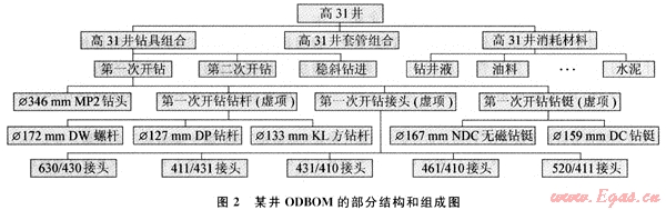 在鉆井過程中,一口井物料的消耗可由鉆井設(shè)計(jì)所形成的鉆具組合、套管組合、鉆井液和其他主要輔助材料等來確定[6]。將鉆井設(shè)計(jì)所形成方案中物料的使用及物料之間的關(guān)系與傳統(tǒng)制造業(yè)BOM進(jìn)行對(duì)比,可構(gòu)造出類似于制造業(yè)ERP中BOM的石油鉆井物料清單(Oil Drilling Bill Of Material,即ODBOM)。在ODBOM的構(gòu)造中,從結(jié)構(gòu)上可將一口井視為一個(gè)產(chǎn)品,結(jié)構(gòu)中的第一層以虛項(xiàng)[3]形式分別表示鉆井過程中鉆具組合、套管組合所需使用器材的模塊和消耗材料模塊。其中消耗材料模塊清單由鉆井液、油料、泥漿等組成。而鉆具組合和套管組合中所使用器材的清單結(jié)構(gòu)需根據(jù)鉆井開次分別構(gòu)造。以鉆具組合中各種鉆井器材使用為例,油氣井的施工過程是由多次開鉆順序組成,每次開鉆鉆進(jìn)過程中所使用的各種鉆井器材等,按照鉆具組合設(shè)計(jì),這些器材之間(如鉆頭、鉆鋌、鉆桿等)是以一定的方式形成連接組合關(guān)系。下面是某口井第一次開鉆的鉆具組合: