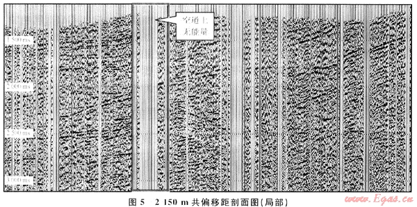 另外,由于該測線穿越的地表起伏較大,受復(fù)雜近地表的影響,野外施工難度較大。為了得到品質(zhì)好的資料,在野外施工中,按照采集規(guī)程,在保證設(shè)計(jì)的覆蓋次數(shù)基礎(chǔ)上,選取較好激發(fā)、接收點(diǎn),采取了較多的變化觀測系統(tǒng),使得炮檢點(diǎn)分布的非常不均勻,局部地段炮點(diǎn)嚴(yán)重缺失。從2150m共偏移距分布圖(圖5)看到,該偏移距剖面資料分布嚴(yán)重不均勻,局部出現(xiàn)資料大塊缺失,反射同相軸能量中斷,資料存在空道現(xiàn)象嚴(yán)重。疊前時(shí)間偏移是在共偏移距中進(jìn)行,這種空間采樣的不均勻,橫向能量差異,在偏移過程中造成能量不能抵消,出現(xiàn)的畫弧使疊前偏移剖面同相軸不連續(xù),是影響成像的主要原因。