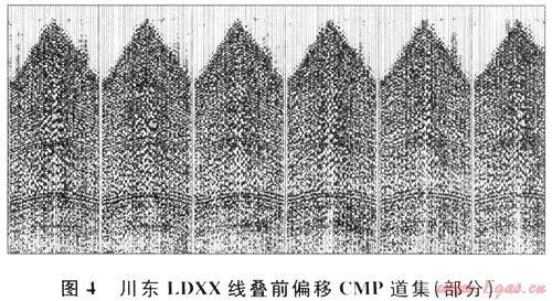 抽取該剖面段的部分輸入道集(圖4為LDXX線偏移前CMP道集),可見信噪比較高,有清楚的反射雙曲線。但仔細(xì)對(duì)比分析,在道集中局部存在大的振幅值。Kirchhoff疊前時(shí)間偏移方法,本質(zhì)是繞射求和。這些大的振幅值或尖脈沖在積分求和的偏移過程中,展開的算子不能被相鄰的其他算子抵消,在偏移剖面上表現(xiàn)為畫弧現(xiàn)象。因此,道集中的噪聲是疊前時(shí)間偏移成像變差的因素之一。