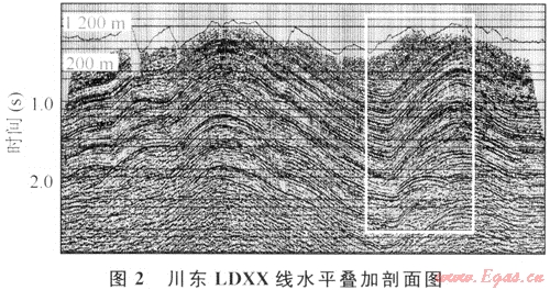 圖2為四川盆地東部某地區(qū)LDXX線水平疊加剖面,剖面上方為地表高程曲線??梢钥闯觯涸摐y線地表起伏劇烈,海拔高程在280~1180m之間,部分地段地形切割厲害,橫向100m范圍內(nèi)高程差達(dá)800m。從水平疊加剖面能看到,資料信噪比較高,但地覆構(gòu)造比較復(fù)雜,各種地震波發(fā)育。根據(jù)以往的地震地質(zhì)經(jīng)驗(yàn)及鉆井分析,該地區(qū)速度橫向變化不大,完全滿足疊前時(shí)間偏移條件,使用疊前時(shí)間偏移技術(shù),能較好地使繞射歸位,提高資料橫向分辨率,較準(zhǔn)確地落實(shí)地腹構(gòu)造形態(tài)。