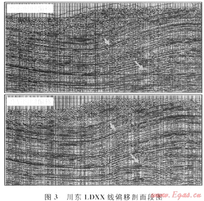 疊前時(shí)間偏移輸入數(shù)據(jù)為每個(gè)炮檢距的信息,沒有零炮檢距的假設(shè),避免了由于共中心點(diǎn)NMO校正疊加所產(chǎn)生的畸變,是構(gòu)造復(fù)雜、橫向速度變化不大地區(qū)成像處理較理想的偏移方法。疊前時(shí)間偏移輸出的CRP道集信息,可以為巖性勘探中油氣的定量檢測提供更好的手段。該偏移技術(shù)已廣泛地應(yīng)用于四川油氣田勘探中,成為常規(guī)的資料處理偏移手段[6]。