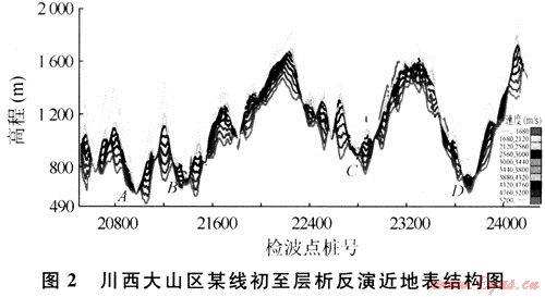 圖2中低速帶速度介于1500~2550m/s之間,降速帶速度超過(guò)3900m/s,厚度橫向變化大,稱之為典型的近代塔式風(fēng)化模式。多少萬(wàn)年前形成嚴(yán)重的切割地形,受大自然風(fēng)化作用,不同部位風(fēng)化程度不同,最尖銳的山尖部位,明顯剝蝕得快些,速度低且厚度大。隨著深度的增加,等速度面速度越來(lái)越高,而橫向上高程的變化越來(lái)越平緩。