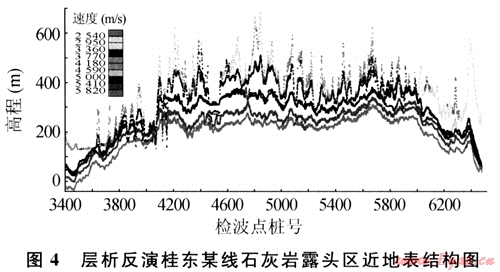 圖4為層析反演桂東石灰?guī)r露頭區(qū)某測(cè)線的近地表結(jié)構(gòu)。不少人認(rèn)為如此石灰?guī)r露頭區(qū)不會(huì)有低速帶,可層析反演的結(jié)果明顯看出,盡管野外看起來(lái)還是石灰?guī)r,但它的表層速度卻只有2000m/s,而且隨著深度的增加逐漸變高,直至沒(méi)有風(fēng)化到的高速層面附近原始石灰?guī)r處。其低速帶速度在2000~5000m/s之間,厚度橫向高頻變化。降速帶速度在5000m/s以上,厚度不是很大??梢?jiàn),其靜校正量的長(zhǎng)周期變化很小,也不會(huì)超過(guò)一個(gè)排列長(zhǎng)度,主要還是高頻成分。