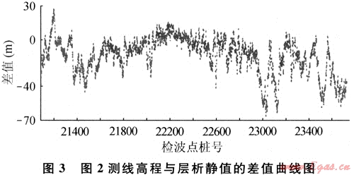 圖3是圖2測(cè)線高程與層析靜值的差值曲線。該曲線是對(duì)近地表結(jié)構(gòu)的非均質(zhì)性測(cè)量,反映出近地表結(jié)構(gòu)對(duì)地震波場(chǎng)的影響??梢钥吹?,該風(fēng)化類型的靜值周期有長(zhǎng)有短,長(zhǎng)周期將影響構(gòu)造形態(tài),短波長(zhǎng)將影響地震成像質(zhì)量。