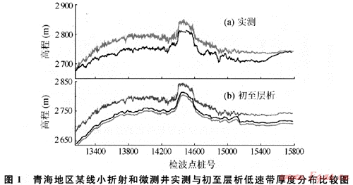 該例子比較典型,因?yàn)樵搮^(qū)低速帶與降速層分界面很清楚,速度差異比較大。無(wú)論用小折射測(cè)量、微測(cè)井測(cè)量還是初至波層析反演,不同操作人員的解釋,其速度分層結(jié)果會(huì)基本一致。而通常情況下,當(dāng)?shù)汀⒔邓賻Эv向上速度變化梯度復(fù)雜時(shí),小折射法、微測(cè)井法、層析方法會(huì)因?yàn)槿藗兊恼J(rèn)識(shí)和分層方式不同,其分層結(jié)果出現(xiàn)多解性。