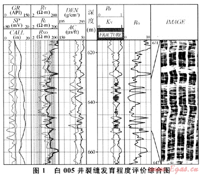 將上述評價裂縫發(fā)育程度指標的計算模型和參考文獻[1]所述巖石力學(xué)動靜態(tài)轉(zhuǎn)換關(guān)系式編制成Fortran語言,掛接在Forward測井解釋平臺上,實現(xiàn)單井逐點可視化處理。對工區(qū)內(nèi)10多口具有成像測井資料和巖心描述的井進行了裂縫發(fā)育程度指標處理,圖1為白005井裂縫發(fā)育程度評價綜合成果圖。由圖1不難發(fā)現(xiàn),630~652m井段,完整性系數(shù)值較低、裂縫發(fā)育程度指標值較高、巖石穩(wěn)定系數(shù)值偏低,從所對應(yīng)的成像測井圖上可以看出,該段斜交縫和網(wǎng)狀縫較為發(fā)育,巖心描述為半充填的低角度和網(wǎng)狀縫。從工區(qū)內(nèi)其他井的處理情況來看,處理結(jié)果與成像測井和巖心描述對應(yīng)性都較好。因此,筆者所述方法對研究工區(qū)火山巖裂縫發(fā)育程度評價較為有效。