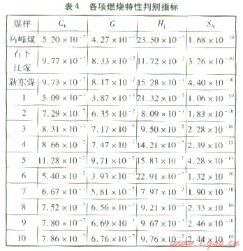 可燃性指數(shù)Cb主要反映煤樣燃燒前期的反應能力,該值越大,表明可燃性越好。各煤樣的可燃性指數(shù)Cb見表4。由表4可知,單煤樣中,石下江煤、新東煤的可燃性較好,烏峰煤的可燃性較差?;烀旱目扇夹曰窘橛趦煞N單煤的可燃性之間,且隨著某種單煤比例的增加,混煤的可燃性指數(shù)Cb逐漸向該煤種靠近。烏峰煤與石下江煤按2:8摻混時,混煤的可燃性明顯變好。