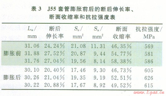 套管在膨脹后,徑向增大幅度可以叫做膨脹的變形程度,也叫做膨脹率。本試驗(yàn)中,l號(hào)、2號(hào)J55套管的膨脹率分別為9.9,8%、9.37%。