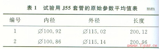 試驗(yàn)中使用APl標(biāo)準(zhǔn)的J55套管(Φ=ll4.30mm,壁厚6.88 mm),其化學(xué)成分(質(zhì)量分?jǐn)?shù),%)為:0.35C,0.31Si,1.39Mn,0.017Ni,0.092M0,0.19Cr,0.004S,0.014P,對兩段套管的實(shí)測原始參數(shù)如表1所示。