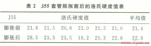 說明外徑的變化比例要小于壁厚的變化比例,即不均勻變形程度越小。據(jù)計(jì)算,1號(hào)、2號(hào)套管膨脹后的Q值分別為0.88、0.89,即l號(hào)套管的不均勻變形程度稍大于2號(hào)套管,也可以說明適當(dāng)?shù)臐櫥怯兄谔坠茉谂蛎涍^程中的均勻變形。2.3洛氏硬度值的變化及原因