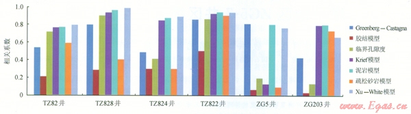 圖2 各種模型實測橫波與預(yù)測橫波相關(guān)系數(shù)圖