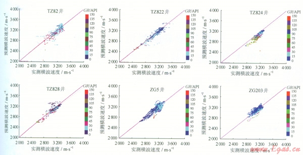 圖3是利用Xu—White模型法對塔中地區(qū)6口井的橫波曲線擬合的實驗結(jié)果。從圖3中可以看出: