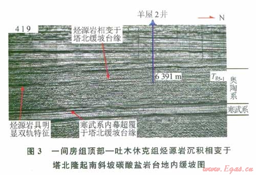但是,通過(guò)對(duì)經(jīng)過(guò)羊屋2井地震剖面(測(cè)線419)的精細(xì)分析(圖3),發(fā)現(xiàn)在羊屋2井南部3 km處存在同相軸Tg5-1及其下面的“雙軌”變“單軌”的巖性相變反射,即代表著上奧陶統(tǒng)良里塔格組石灰?guī)r頂面Tg5-1之下的強(qiáng)反射軸發(fā)生相變。同時(shí)經(jīng)多條地震剖面相互閉合、連接確認(rèn),此發(fā)生相變的“雙軌”同相軸與過(guò)塔中29井烴源巖發(fā)育位置的強(qiáng)相位反射顯示的是同一套地層發(fā)射。據(jù)此認(rèn)為,中上奧陶統(tǒng)一間房組頂部—吐木休克組烴源巖沉積相變于塔北隆起南斜坡羊屋2井南3 km處的碳酸鹽巖臺(tái)地內(nèi)緩坡。