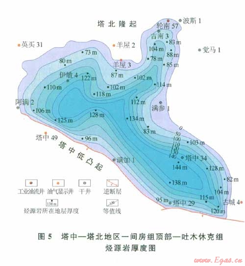 從圖5可知,此套烴源巖在呈近北西方向上沉積厚度較大,說(shuō)明在中奧陶世晚期—晚奧陶世早期,塔北隆起塔中地區(qū)沉積水體較深且為沉積凹陷區(qū)。由圖2與圖3可知,代表石灰?guī)r沉積頂面的地震反射同相軸Tg5-1僅為巖性反射界面,其也是一個(gè)穿時(shí)界面。反射同相軸Tg5-1在滿加1井及塔中低凸起、羊屋2井及輪南地區(qū)則是上奧陶統(tǒng)良里塔格組頂面反射,而在烴源巖發(fā)育的阿—滿過(guò)渡帶則代表中奧陶統(tǒng)一間房組頂面(含上奧陶統(tǒng)吐木休克組)。