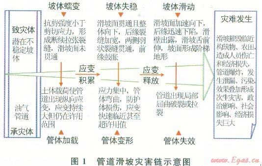 災(zāi)害監(jiān)測的關(guān)鍵是及時發(fā)現(xiàn)災(zāi)變前兆,進(jìn)而做出預(yù)報預(yù)警。地質(zhì)災(zāi)害的“致災(zāi)性”難以逆轉(zhuǎn),但管道地質(zhì)災(zāi)害是典型的、致災(zāi)體與承災(zāi)體之間明顯相關(guān)的“因果型災(zāi)害鏈”,只要適時掌握其應(yīng)變釋放的過程性指征和指標(biāo),就有可能及時預(yù)警,“防患于未然”。圖1以管道滑坡災(zāi)害鏈為例,勾勒了管道滑坡從應(yīng)變積累到應(yīng)變釋放的交互作用和演進(jìn)過程[4],這一過程也給災(zāi)前預(yù)警和災(zāi)害治理提供了理論依據(jù)。
