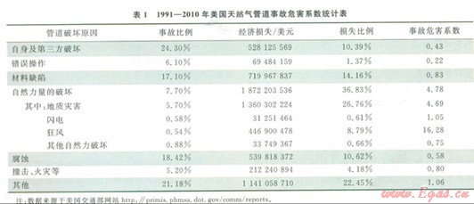 長輸油氣管道沿途的地質(zhì)災(zāi)害種類多、成因復(fù)雜、范圍廣,所導(dǎo)致的管道事故又極易誘發(fā)嚴(yán)重的次生災(zāi)害,其直接和間接損失往往比其他類別的事故更大【1-2】。美國交通部數(shù)據(jù)顯示,1991-2010年雖然美國由于地質(zhì)災(zāi)害導(dǎo)致管道破壞的統(tǒng)計頻率僅為5.7%,但是由其帶來的經(jīng)濟(jì)損失卻高達(dá)l3.6億美元,占全部經(jīng)濟(jì)損失的26.76%;如果將“事故危害系數(shù)”(Accident Hazard Index,簡稱AHI)定義為“該類事故損失金額占全部損失的比例”除以“該類事故占全部事故的比例”,并以此對比平均每發(fā)生l次事故所帶來經(jīng)濟(jì)損失的大小,可得到l991-2010年美國天然氣管道事故危害系數(shù)統(tǒng)計表(表1)。