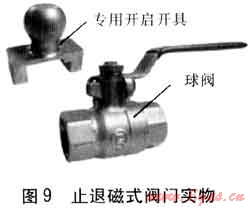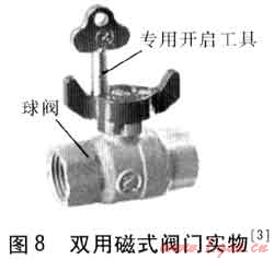 圖8所示閥門為可實現(xiàn)可關(guān)不可開或可自由開關(guān)與可關(guān)不可開互換功能的雙用磁式產(chǎn)品,當(dāng)閥門處于可關(guān)不可開狀態(tài)時,須通過專用開啟工具才能實現(xiàn)自由開關(guān)。該結(jié)構(gòu)關(guān)鍵技術(shù)在于閥體凸頸部有兩凸臺,凸臺上有平行凸頸中心線的盲孔,手柄正上端面設(shè)有A和B標(biāo)志的兩螺紋孔以及帶強磁的A和B的螺塞。當(dāng)閥門需要從關(guān)閉到開啟狀態(tài)實現(xiàn)可關(guān)不可開的功能時,只需通過專用開啟工具將手柄上A螺紋孔安裝B螺塞或B螺紋孔安裝A螺塞或A、B螺塞任意去掉其中一個或A、B螺塞都不安裝,即可實現(xiàn);當(dāng)閥門需要實現(xiàn)可自由開關(guān)與可關(guān)不可開互換的功能,只需通過專用開啟工具將手柄上A螺紋孔安裝A螺塞或B螺紋孔安裝B螺塞,利用磁場“同性相斥,異性相吸”的原理,即可實現(xiàn)作為普通閥門自由開關(guān)功能。產(chǎn)品出廠一般設(shè)置為可關(guān)不可開的狀態(tài)。