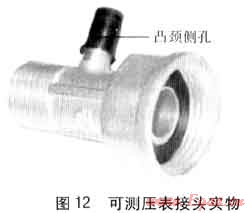 如圖12所示,可測壓表接頭是安裝于燃?xì)庥嬃勘磉M(jìn)出口端的產(chǎn)品。在普通表接頭的基礎(chǔ)上研制出可測壓表接頭,可測壓表接頭上帶有一個具有凸頸的側(cè)孔,能夠方便地將測壓儀表通過凸頸安裝在表接頭上。通常情況下該側(cè)孔采用密封圈、螺釘及防護(hù)套堵住,保證管道密封性。當(dāng)需要測壓時,去掉密封圈、螺釘及防護(hù)套,打開側(cè)孔,安裝上測壓儀表即可測量壓力。測完之后,拆下測壓儀表,再采用密封圈、螺釘及防護(hù)套將側(cè)孔堵住,保證普通表接頭原有功能。