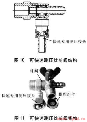 圖10、11所示閥門為可實現(xiàn)不用關(guān)閉或切斷管道燃?xì)獾那闆r下進(jìn)行快速測壓的燃?xì)忾y門。不要測壓時,灶前閥處于開啟狀態(tài),測壓裝置處于常自閉狀態(tài),即密封狀態(tài)。需要測壓時,只需逆時針擰下螺帽組件,將快速專用測壓接頭連接到測壓接口,使快速專用測壓接頭接觸預(yù)設(shè)測壓工作區(qū)域,并逐步順時針擰緊,推動閥芯壓縮彈簧向內(nèi)移動,使測壓接口內(nèi)的密封口脫離密封臨界設(shè)置同時達(dá)到無外泄漏,從而使燃?xì)忭樌鲃印.?dāng)測壓完畢后,將快速專用測壓接頭逆時針擰出測壓接口,密封墊在彈簧的作用下迅速歸位,達(dá)到無泄漏狀態(tài),擰緊螺帽組件進(jìn)行保險密封,可以實現(xiàn)快速、安全地進(jìn)行測壓作業(yè)。該產(chǎn)品公稱壓力不大于1.6MPa,工作溫度為-20~120℃。