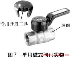 圖7閥門為可實現(xiàn)可關(guān)不可開功能的單用磁式閥門,閥門關(guān)閉后只能通過專用開啟工具才能實現(xiàn)自由開啟。該結(jié)構(gòu)關(guān)鍵技術(shù)在于閥體有扇形凸臺,在扇形凸臺的軸向端和徑向端分別設(shè)置相垂直的兩個盲孔,手柄按閥體扇形凸臺徑向和軸向相垂直盲孔對應(yīng)位置分別開設(shè)相對應(yīng)的盲孔。閥體扇形凸臺上軸向和徑向盲孔和手柄內(nèi)的磁銷、彈簧能準(zhǔn)確地按對應(yīng)預(yù)設(shè)盲孔插入,即可實現(xiàn)可關(guān)不可開功能。當(dāng)閥門需要正常工作時,只能通過專用開啟工具內(nèi)的強磁與閥內(nèi)的磁銷通過磁場“同性相斥,異性相吸”的原理實現(xiàn)自由開啟閥門。產(chǎn)品出廠時一般設(shè)置為開啟狀態(tài)。