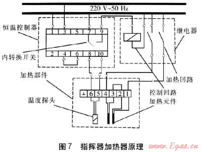 指揮器加熱器結(jié)構(gòu)簡(jiǎn)單,主要由加熱部件(見(jiàn)圖6)、恒溫控制器和繼電器三部分組成,其中恒溫控制器和繼電器只能安裝在非防爆區(qū)域,通過(guò)導(dǎo)線(xiàn)對(duì)加熱部件進(jìn)行連接,加熱部件則通過(guò)配件安裝在調(diào)壓器指揮器上游信號(hào)管上,通過(guò)加熱部件中的加熱元件對(duì)指揮器信號(hào)管內(nèi)的燃?xì)膺M(jìn)行加熱。指揮器加熱器是通過(guò)不同的元器件的綜合作用達(dá)到自動(dòng)控制加熱的目的,原理見(jiàn)圖7,圖中的數(shù)字1~10為開(kāi)關(guān)接線(xiàn)端子編號(hào),接線(xiàn)時(shí)按圖7要求,其中2、5端子為備用。設(shè):