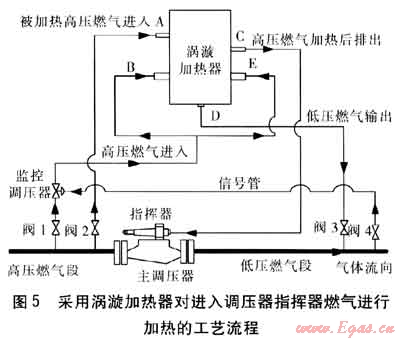 采用渦漩加熱器對(duì)進(jìn)入調(diào)壓器指揮器燃?xì)膺M(jìn)行加熱的工藝流程見(jiàn)圖5。