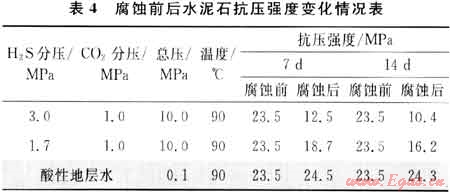 表4是指定水泥石在水濕H2S+C02復(fù)合酸性氣體環(huán)境及酸性地層水中界面腐蝕7d和14d后抗壓強(qiáng)度變化情況。