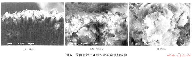由顯微照片圖6-a可以看到腐蝕后的水泥石表面包裹著一層腐蝕產(chǎn)物,由掃描電鏡(sEM)看出該包被層屬于致密性的。在致密包被層的下面是水泥石的內(nèi)部結(jié)構(gòu),由圖6、7對比看出,腐蝕后的水泥石內(nèi)部結(jié)構(gòu)相對致密層來說較為疏松,能觀察到部分較大的孔洞,這些孔洞可能是腐蝕介質(zhì)和水泥石中的水化產(chǎn)物反應(yīng)留下的,同時(shí)反應(yīng)的腐蝕產(chǎn)物通過孔洞和凝膠孔等被運(yùn)移到水泥石的表面,最終使水泥石的表面形成致密包被層。