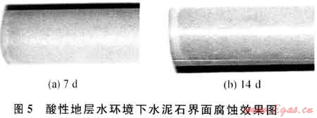 表5是指定水泥石在水濕H2S+C02復(fù)合酸性氣體環(huán)境及酸性地層水中界面腐蝕7d和14d后的孔隙度和滲透率變化情況。