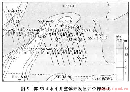 在蘇53-4水平井整體開(kāi)發(fā)區(qū),取得重要進(jìn)展。2010年確定蘇53-4井區(qū)作為水平井規(guī)模開(kāi)發(fā)先導(dǎo)試驗(yàn)區(qū)。部署水平井20口(圖5),建成產(chǎn)能4×108m3。開(kāi)鉆20口,完鉆19口,壓裂投產(chǎn)18口。完鉆水平井19口,平均水平段長(zhǎng)867.6m,平均砂巖段長(zhǎng)747.1m,砂巖鉆遇率達(dá)86.6%,平均有效儲(chǔ)層長(zhǎng)493.9m,有效儲(chǔ)層鉆遇率為57.4%。水平井整體開(kāi)發(fā)先導(dǎo)試驗(yàn)取得階段性成果。