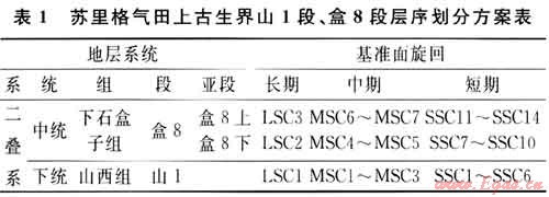 在對(duì)蘇里格地區(qū)地表露頭和鉆井巖心、測(cè)井、地震資料綜合分析的基礎(chǔ)上,利用Cross倡導(dǎo)的高分辨率層序地層學(xué)的理論體系和研究方法,根據(jù)基準(zhǔn)面升降旋回特點(diǎn)及等時(shí)對(duì)比原則、沉積物體積劃分與堆積方式、沉積體系配置以及層序界面特征等因素,將蘇里格氣田上古生界的山1段、盒8段組共劃分為3個(gè)長(zhǎng)期旋回、7個(gè)中期旋回和14個(gè)短期旋回(表1),其中的長(zhǎng)、中期旋回層序分別與巖石地層劃分方案中的巖性段和亞段單元有很好的對(duì)應(yīng)關(guān)系[1]。