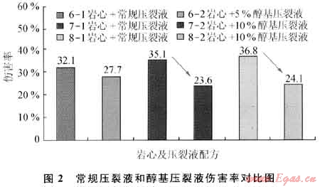室內(nèi)對(duì)研制的醇基壓裂液性能進(jìn)行實(shí)驗(yàn)評(píng)價(jià),結(jié)果表明:①醇基壓裂液的表面張力低于26mN/m,低于水基壓裂液;②防膨率在80%以上,優(yōu)于水基壓裂液;③殘?jiān)繛?62mg/L,低于550mg/L的行業(yè)標(biāo)準(zhǔn);④用K2X井巖心實(shí)驗(yàn)醇基壓裂液的傷害率在23.65%~27.7%之間,而水基壓裂液的傷害率在32.1%~36.8%之間,可見醇基壓裂液傷害率比常規(guī)壓裂液降低幅度約1/3(圖2);⑤甲醇的加入有利于降低壓裂液的表面張力和黏度,從而有利于壓裂液施后的返排,降低了壓裂液對(duì)儲(chǔ)層的傷害。
