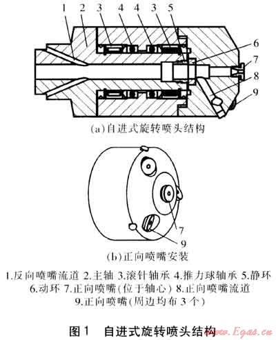自進(jìn)式旋轉(zhuǎn)射流解堵工藝的關(guān)鍵設(shè)備為自進(jìn)式旋轉(zhuǎn)噴頭,其結(jié)構(gòu)見(jiàn)圖1。