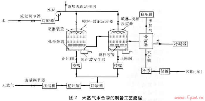 進(jìn)入水合物反應(yīng)器前,水和天然氣各自通過(guò)一條支路流動(dòng)。天然氣由流量調(diào)節(jié)器控制流量,經(jīng)儀表測(cè)量工藝參數(shù)(如壓力、溫度、流量等參數(shù)),就地指示及遠(yuǎn)傳至計(jì)算機(jī)控制系統(tǒng),經(jīng)壓縮機(jī)增壓至略高于反應(yīng)壓力后進(jìn)入穩(wěn)壓罐(維持水合反應(yīng)時(shí)的壓力穩(wěn)定)。再經(jīng)儀表測(cè)量工藝參數(shù),經(jīng)冷凝器冷凝,分兩支路依次經(jīng)噴嘴和止回閥后,分別進(jìn)入噴淋-鼓泡反應(yīng)器和噴淋-攪拌反應(yīng)器底部。
