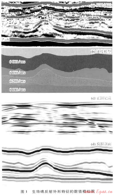 采用相同的方法,對(duì)29個(gè)不同的生物礁模型進(jìn)行了地震響應(yīng)的數(shù)值模擬,綜合多個(gè)模型的數(shù)值模擬結(jié)果可以將生物礁在時(shí)間剖面上的特征歸納為以下3項(xiàng):①外形上,呈丘狀或杏仁狀隆起,兩翼對(duì)稱或非對(duì)稱;②由于礁體內(nèi)部充填物性的差異,生物礁頂部的反射有時(shí)呈強(qiáng)反射,有時(shí)也呈弱反射,生物礁內(nèi)部多雜亂反射,隱約成層,反射有時(shí)強(qiáng),有時(shí)弱;③由于長(zhǎng)興組總體上處于海侵期,與生物礁巖隆伴隨的披覆、上超現(xiàn)象明顯。通過(guò)上述特征的數(shù)值模擬,為生物礁的地震識(shí)別提供了理論依據(jù)。