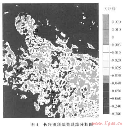 圖4是長(zhǎng)興組頂部關(guān)聯(lián)維分析結(jié)果。實(shí)鉆的B102井和8103h井在長(zhǎng)興組上部鉆遇礁蓋白云巖儲(chǔ)層,B102井測(cè)試獲工業(yè)氣流,不含水,而8103h井出水,且海拔位置比B102井還高,證明這2口井分屬不同的氣藏,儲(chǔ)層預(yù)測(cè)及反演結(jié)果難以進(jìn)行區(qū)分,而基于波形復(fù)雜程度的關(guān)聯(lián)維分析表明兩二者之間存在變化且互不連通。因此可以利用反映波形復(fù)雜程度的屬性來(lái)刻畫儲(chǔ)層的非均質(zhì)性和復(fù)雜性,但無(wú)法區(qū)分礁和灘。