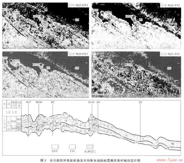 圖3是在長(zhǎng)興期層序格架劃分基礎(chǔ)上,對(duì)兩個(gè)Ⅲ級(jí)層序中控制儲(chǔ)層發(fā)育的體系域進(jìn)行地震屬性的等時(shí)地層切片,能較好地反映了長(zhǎng)興組礁、灘體的發(fā)育和演化規(guī)律。長(zhǎng)一段下部為海侵體系域(SQ1-TST),B1井及以西地區(qū)為開(kāi)闊臺(tái)地相沉積,B1井以東相變?yōu)榕_(tái)地邊緣斜坡陸棚沉積,儲(chǔ)層不發(fā)育。長(zhǎng)一段上部為高位體系域(SQ1-HST),B5井西南地區(qū)為臺(tái)地邊緣淺灘相沉積,淺灘相儲(chǔ)層發(fā)育;B1井以東相變?yōu)榕_(tái)地邊緣斜坡陸棚沉積,地層薄,儲(chǔ)層不發(fā)育。長(zhǎng)二段下部為海侵體系域(SQ2-TST),B5井以西南地區(qū)為開(kāi)闊臺(tái)地相沉積,局部地勢(shì)較高部位(如B101井)發(fā)育生屑白云巖儲(chǔ)層;B1、B5井以東地區(qū)相變?yōu)榕_(tái)地邊緣斜坡 陸棚沉積,儲(chǔ)層不發(fā)育。長(zhǎng)二段上部為高位體系域(SQ2-HST),B5、B1井以西南地區(qū)為臺(tái)地邊緣礁灘沉積,儲(chǔ)層發(fā)育,物性好、厚度大、分布廣;B1、B5井以東地區(qū)相變?yōu)榕_(tái)地邊緣斜坡-陸棚沉積,儲(chǔ)層不發(fā)育。因此,長(zhǎng)興組的儲(chǔ)層明顯受到沉積體系域的控制,主要發(fā)育在高位體系域內(nèi)的臺(tái)地邊緣礁灘相中,并且表現(xiàn)為早期以灘相沉積為主,晚期以礁相沉積為主,平面上具有前礁后灘的特點(diǎn)。