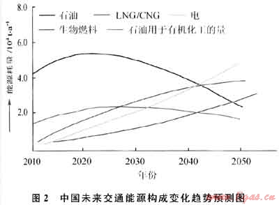 在向低碳能源轉(zhuǎn)型的歷史時期,目前還占世界一次能源消費首位(35%)、主要用于交通燃料的石油大部分將在2050年被其他低碳清潔能源所替代。圖2是中國未來交通能源構成變化趨勢預測圖。事實上,2011年3月21日歐盟委員會已向歐洲議會提出了“2050年禁止使用汽柴油車,2030年汽柴油車使用減半”的法案。IEA估計生物燃料將于2040年成為主力航空燃料,到2050年其應用將占全球運輸業(yè)的25%。國際天然氣汽車協(xié)會預計世界天然氣交通工具將以年增17.8%的速度增長,到2020年將達6500萬輛,約為2005年汽車總量的9%。隨著科技進步的加速,上述轉(zhuǎn)型的進程很可能還將加快。