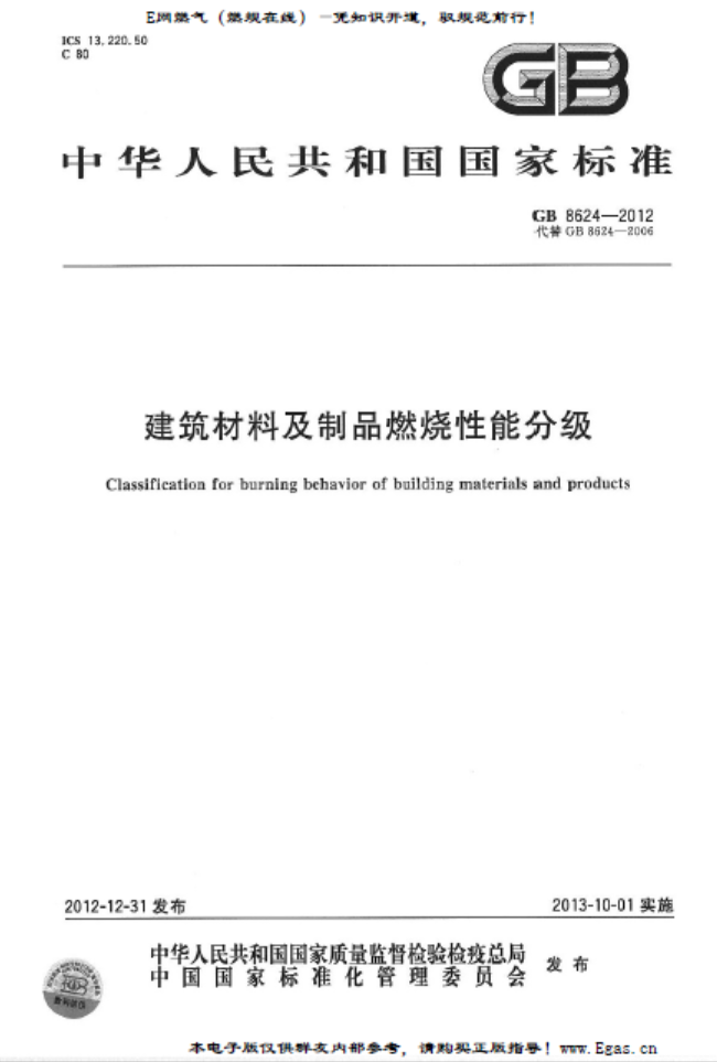 建筑材料及制品燃燒性能分級(jí)GB 8624-2012:本標(biāo)準(zhǔn)規(guī)定了建筑材料及制品的術(shù)語和定義、燃燒性能等級(jí)、燃燒性能等級(jí)判據(jù)、燃燒性能等級(jí)標(biāo)識(shí)和檢驗(yàn)報(bào)告。